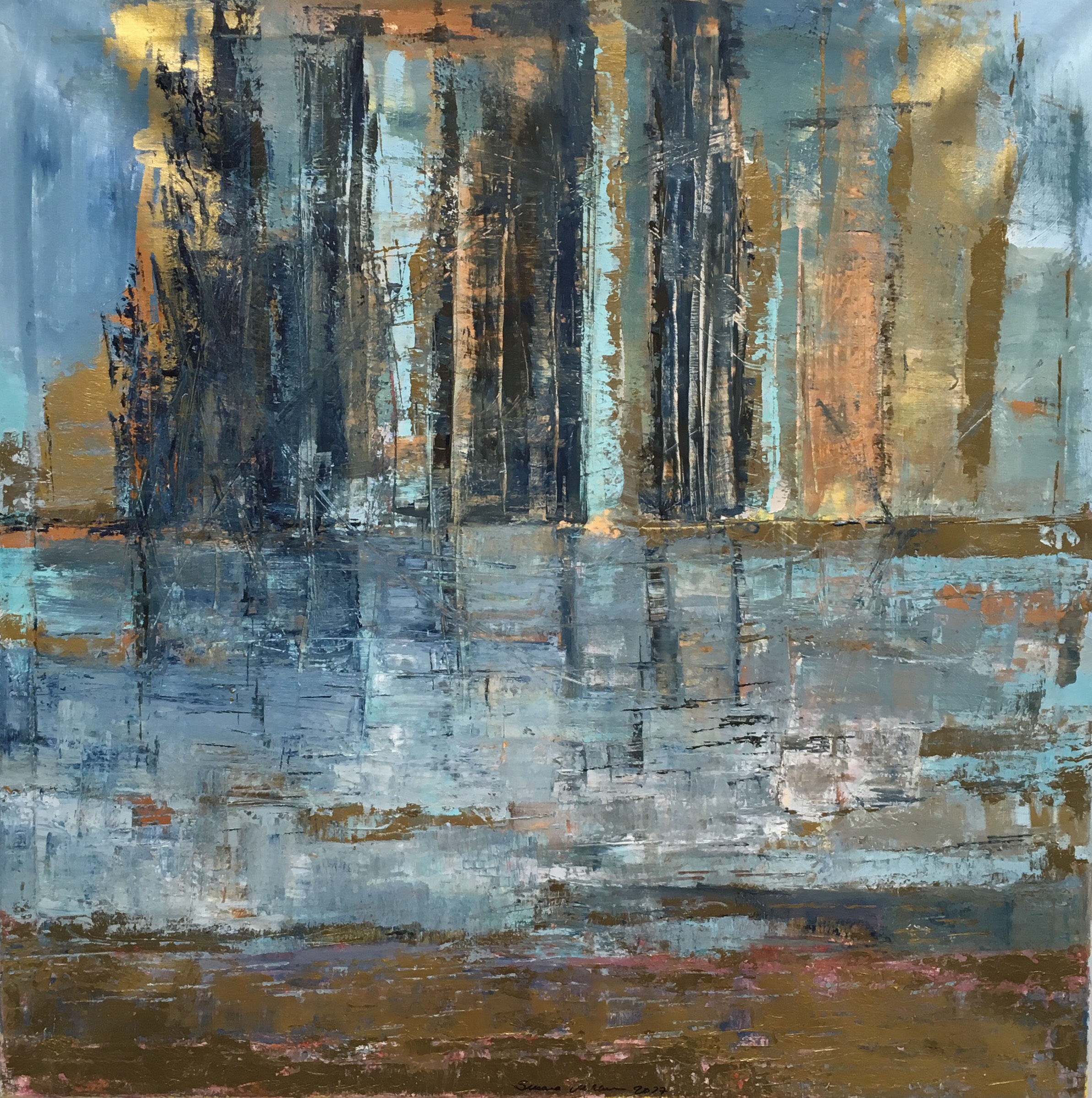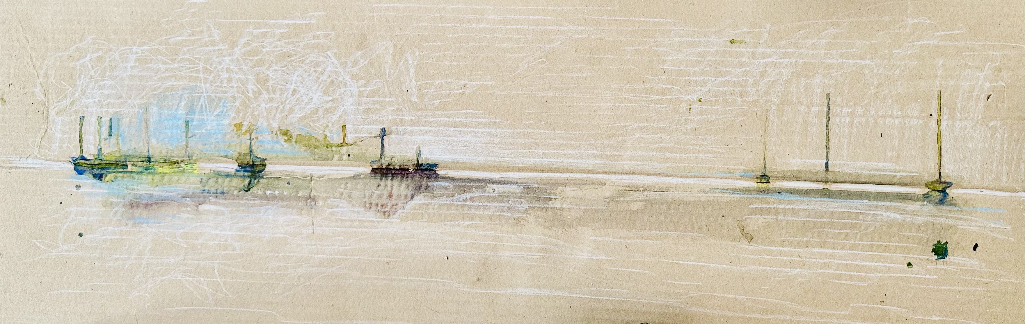Tämä yllä näkyvä kuva syntyi sattumalta, jos sattumaa nyt ylipäätään on, kun työstin tiettyjä unieni kuvia ja akvarelliväri valui pöytää suojaavalle aluspahville. Kun suoristin sen, huomasin, miten eteeni avautuvassa maisemassa veneet näyttävät saapuneen satamaan – kuten minäkin useissa viimeaikaisissa unissani.